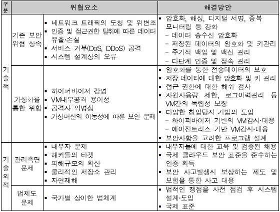 클라우드 보안 사고 3대 유형으로는 데이터 유출, 계정 탈취 및 손상, 그리고 자원 착취 및 손상과 같은 형태로 분류됩니다. 이에 많은 IT 기관 및 기업에서는 클라우드 보안 이슈에 대응하기 위한 보고서와 발표를 내놓고 있습니다. 대표적으로 최근 CSA(Cloud Security Alliance)가 <클라우드 컴퓨팅에 대한 12가지 주요 위협: 산업 인사이트 보고서>를 통해 발표한 내용에 따르면, 이들은 문제의 대부분이 기술적 문제보다 기술 외적(사람)인 문제라고 언급했습니다. 순수 기술적인 문제로 불거질 수 있는 보안 문제는 시스템 취약성, 지능형 지속 공격, 분산 서비스 거부 공격이며, 기술 외적인 문제는 주로 불충분한 관리와 부주의, 내부자의 도덕적 해이 등이 주원인으로 파악했습니다.