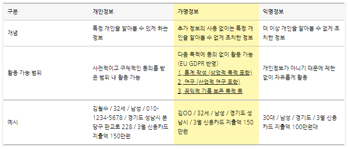 이해를 돕기 위해 개인정보, 가명정보, 익명정보의 차이점을 간략하게 정리해보았습니다.