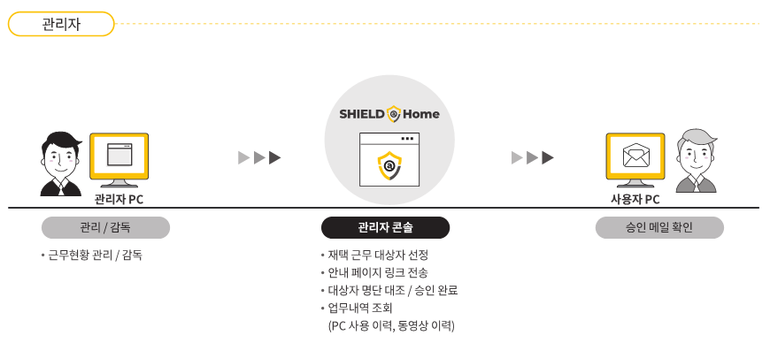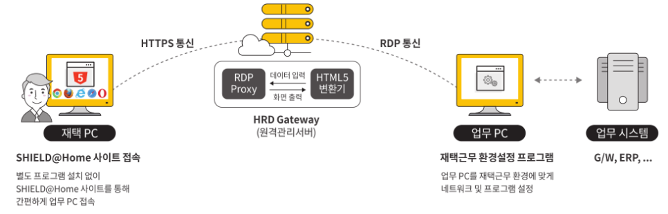 네트워크의 구성/설정 변경 없이 웹 기반 접속으로 손쉽고 간편한 재택근무가 가능한 SHIELD@Home은 원격 디바이스에 설치되는 프로그램이 없어 재택근무를 위한 핵심 기능만으로 사용자에게 편의성을 제공합니다.
