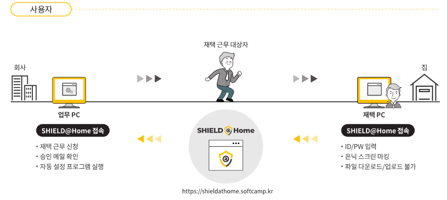 소프트캠프는 기업이나 기관이 고민하는 원격지 근무 체제로의 손쉬운 전환을 위해 업무 효율성과 보안성, 구축 및 관리의 용이성, 도입 비용 절감 등 현장의 다양한 요구사항을 반영한 원격근무솔루션 SHIELD@Home을 출시했습니다.