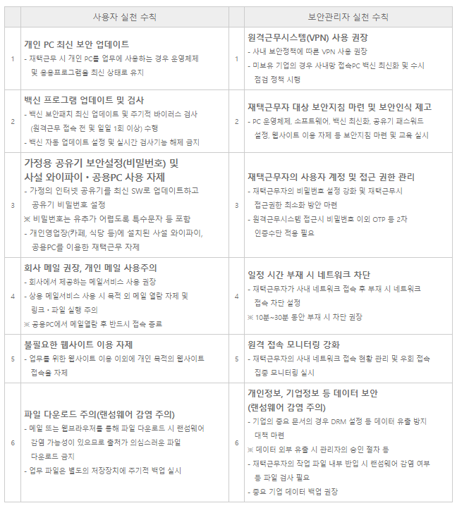 안전한 원격 근무를 위해서는 가장 기본적으로 사용자와 보안관리자가 지켜야 할 보안 수칙(상단 표 참고)을 숙지할 것을 당부합니다. 기업의 보안담당자라면 이러한 지침을 충족하는 보안 솔루션을 갖추고 있는지 다시 한 번 점검해야 하며, 회사의 정책, 근무 환경, 인프라 등을 고려하여 최적화된 재택근무 보안 정책을 수립할 수 있어야 합니다.
