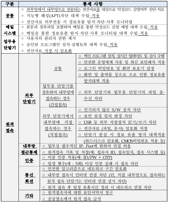 아래 표의 정보보호 대체 통제방안을 의무적으로 적용할 것을 고지한 이번 개정안에서는 망 분리 규제 개선 내용과 함께 원격접속 사용자의 정보 및 활동 이력을 기록하고 원격접속 시 이중 인증을 적용해야 하는 등의 내용을 명시했습니다. 더욱 상세한 내용은 금융감독원 홈페이지에서 확인할 수 있습니다.
